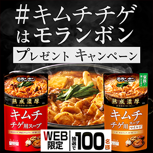 - モランボン主催WEB限定「 #キムチチゲはモランボン プレゼントキャンペーン」で抽選で100名様に「熟成濃厚キムチチゲ用スープ」2種×各1パックをプレゼント!