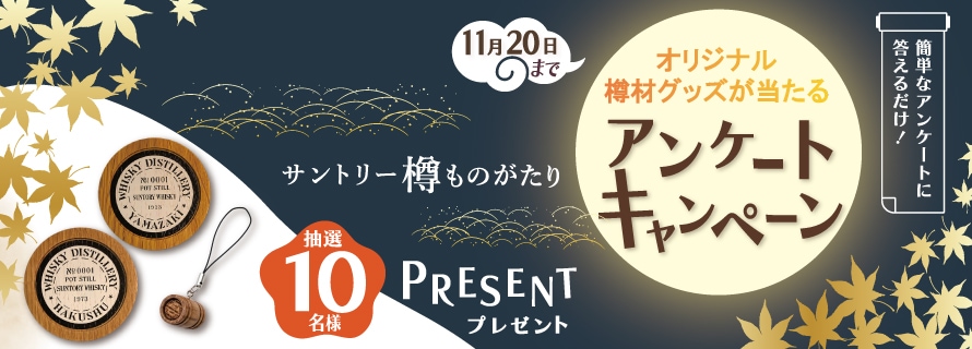 - 「サントリー樽ものがたり オリジナル樽材グッズ」 10名様 樽オーク コースター彩(山崎マーク)1個 樽オーク コースター彩(白州マーク)1個 樽型ストラップ 1個