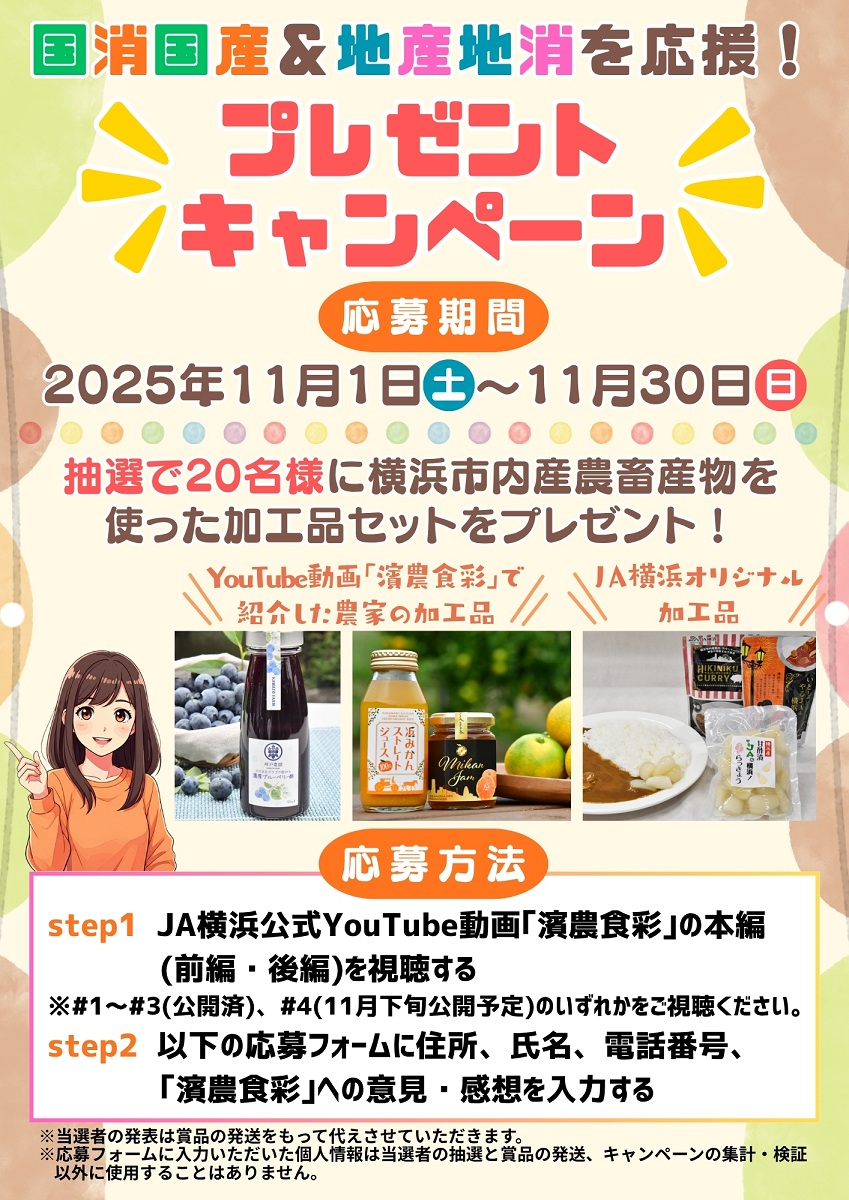 - JA横浜オリジナル加工品を抽選で20名様にプレゼントします。