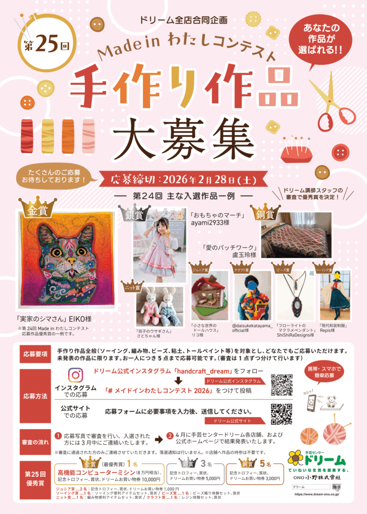- 金賞(最優秀賞)…1名 / 高機能コンピュータミシン(8万円相当)、記念トロフィー、賞状、ドリームお買物券 10,000円他