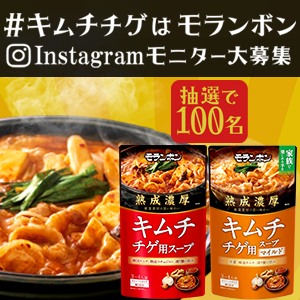 - モランボン【公式】(Instagram)では、「熟成濃厚キムチチゲ用スープ」「熟成濃厚キムチチゲ用スープ マイルド」のInstagramモニター(100名)を大募集!