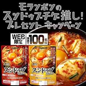 - モランボン主催WEB限定「モランボンのスンドゥブチゲ推し!プレゼントキャンペーン」で抽選で100名様に「スンドゥブチゲ用スープ」の2種各1パックをプレゼント!