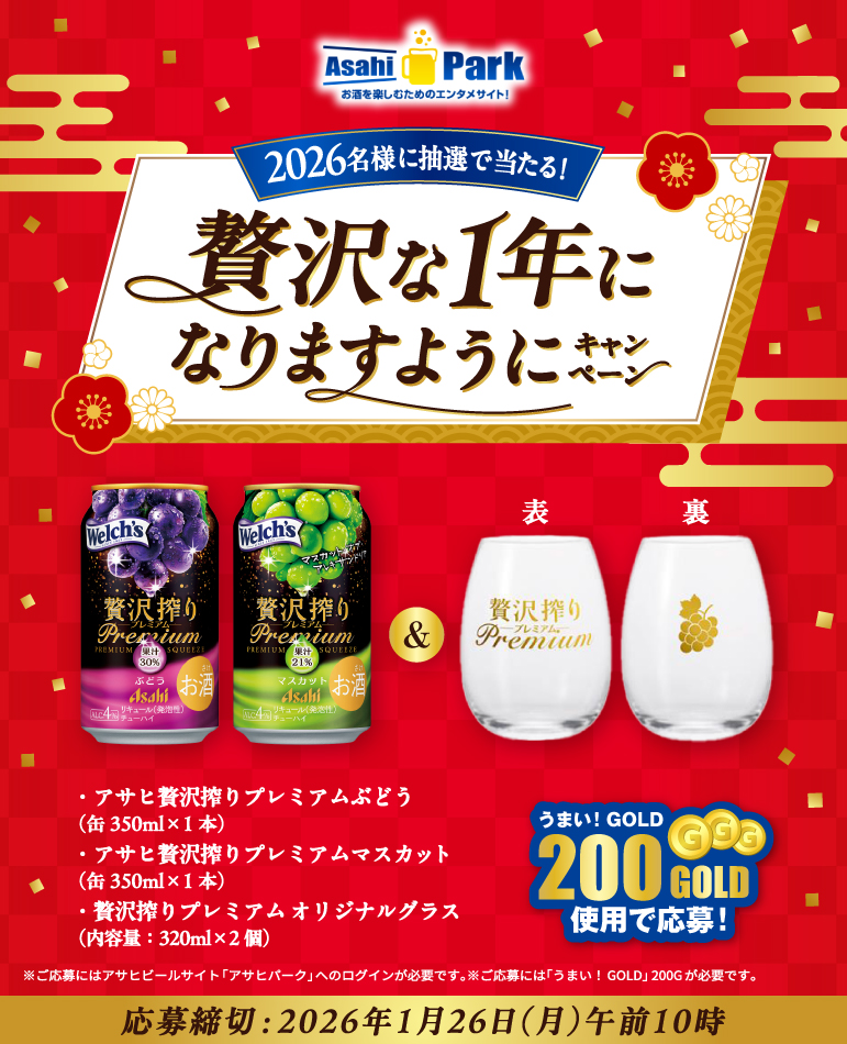 - 2026名様に抽選で当たる! 贅沢搾りプレミアム ぶどう(缶350ml×1本) マスカット(缶350ml×1本) オリジナルグラス(内容量:320ml×2個)