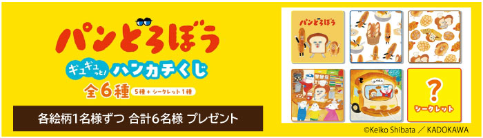 - 大人気絵本「パンどろぼう」とのコラボ! 日本出版販売「パンどろぼう ギュギュっと!ハンカチくじ」<全6種>を各絵柄を1名様ずつ合計6名様にプレゼント!