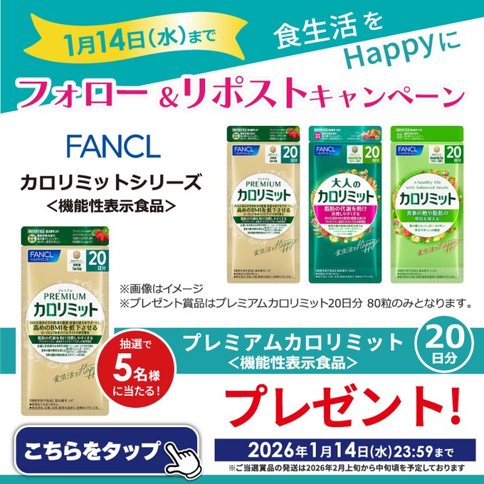 - 抽選で5名様に「ファンケル プレミアムカロリミット20日分」をプレゼント