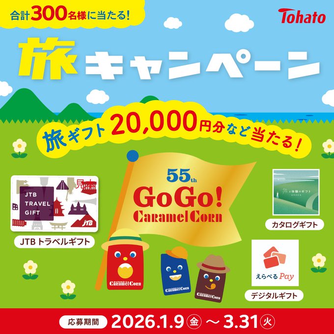 - キャラメルコーン誕生55周年 旅ギフト20,000円分など当たる!
