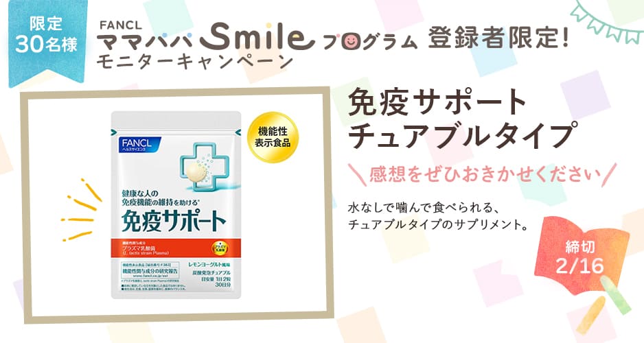 - 30名様に、健康な人の免疫機能維持を助ける機能性表示食品「免疫サポート チュアブルタイプ」をプレゼント