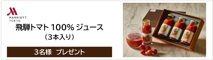 - 岐阜県飛騨高山で育まれたミニトマト「キャロルポポ」を、ひと瓶に約25個使用した無添加ストレートジュース、名古屋マリオットアソシアホテル「飛騨トマト100%ジュース(3本入り)」