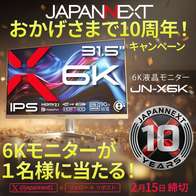 - この度10周年を迎えたJAPANNEXTより、皆様への大きな感謝を込めて、6Kモニター「JN-X6K」を1名様にプレゼントいたします!