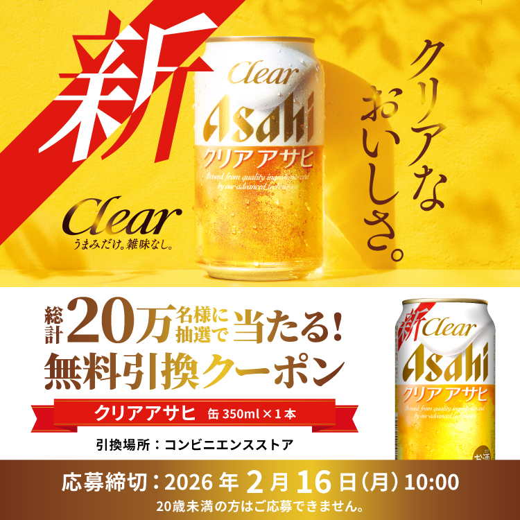- 200,000名様にクリア アサヒ(缶350ml×1本)コンビニ無料引換えクーポン