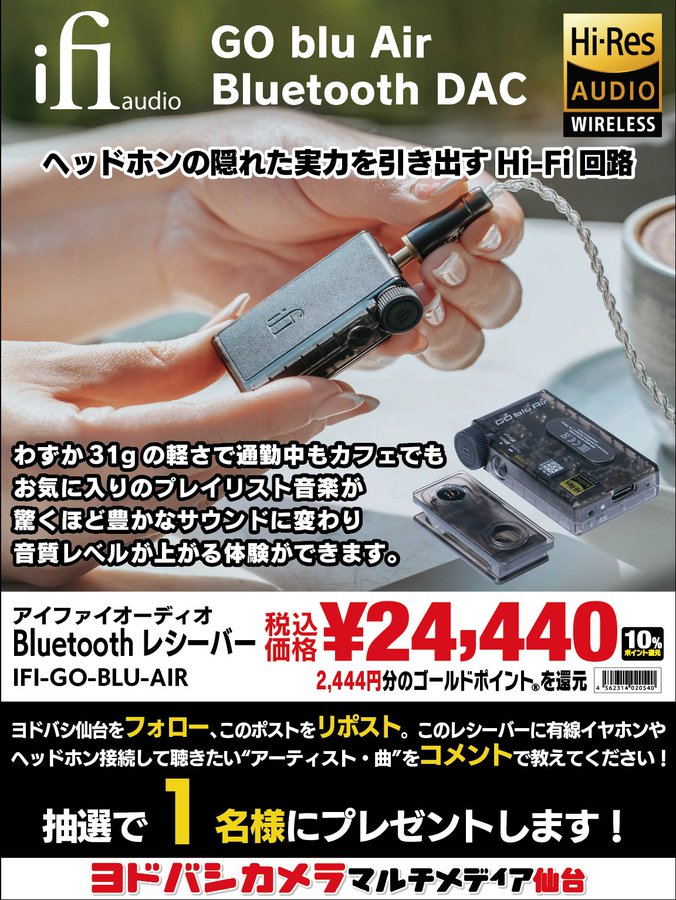 - 有線ヘッドホン・イヤホンをBluetooth対応に 音質が向上するDAC内蔵 Bluetooth レシーバー アイファイオーディオ「GO blu Air」を抽選で1名様に