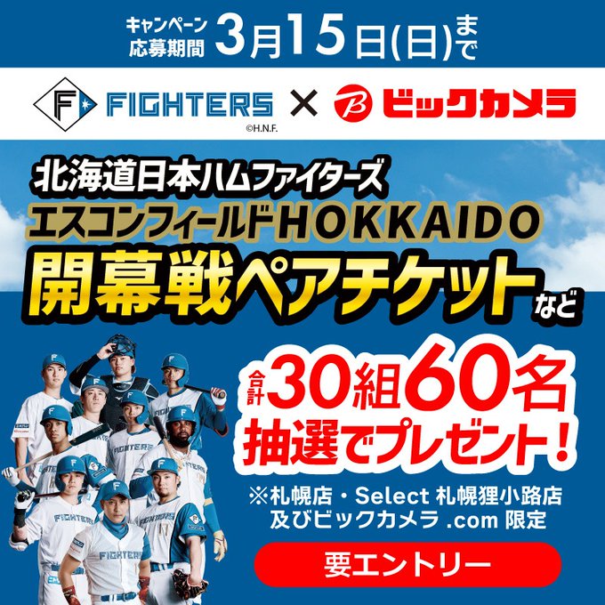 - 抽選で30組60名様にエスコンフィールドHOKKAIDO開幕戦ペアチケットなどが当たる