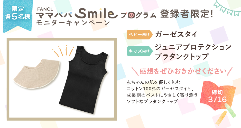 - 各5名様にコットン100%のガーゼスタイ、または成長期のバストにやさしく寄り添うジュニアプロテクション ブラタンクトップをプレゼント
