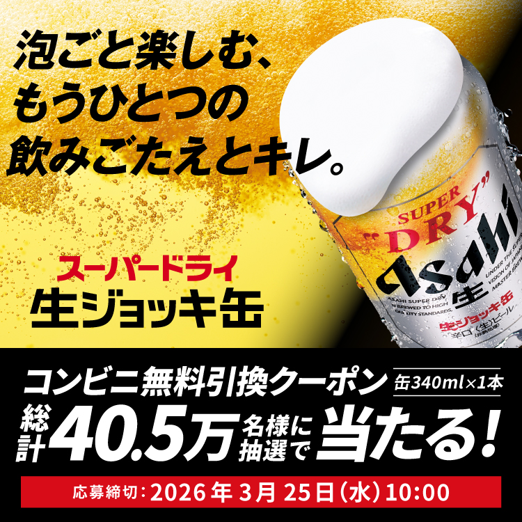 - 405,000名様にアサヒスーパードライ 生ジョッキ缶(缶340ml×1本)コンビニ無料引換えクーポン