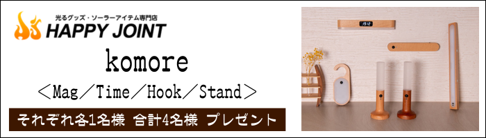 - 天然木シリーズの室内用人感センサーライト、HAPPYJOINT「komore」シリーズよりMag、Time、Hook、Standをそれぞれ各1名様合計4名様にプレゼント!