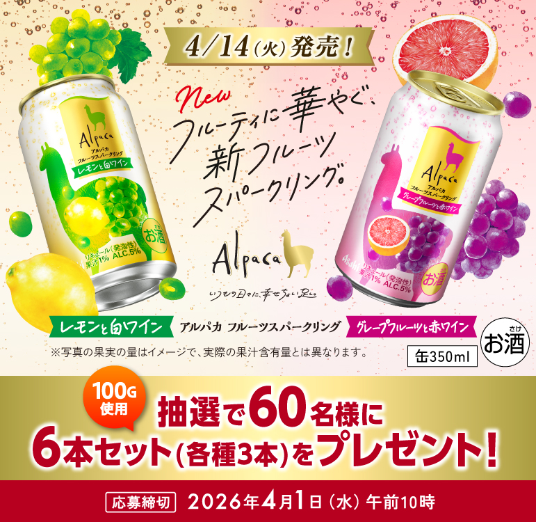 - 60名様に「アルパカフルーツスパークリング」2種6本セットが当たる アルパカフルーツスパークリング レモンと白ワイン グレープフルーツと赤ワイン