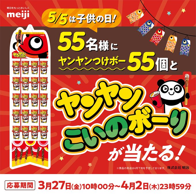 - 55名様にヤンヤンつけボー55個と、ヤンヤンつけボーを飾れるこいのぼり「ヤンヤンこいのボーり」が当たる