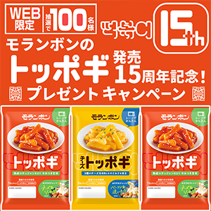 - モランボン主催WEB限定「トッポギ発売15周年記念!プレキャン」開催中!大人気の「トッポギ」と「チーズトッポギ」合計3パックが抽選(100名様)に当たります!!
