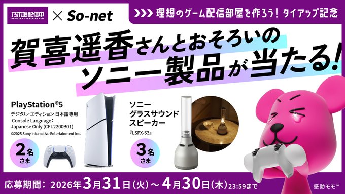 - 乃木坂46 賀喜遥香さんとおそろいのソニー製品が計5名さまに当たる! PS5® デジタル・エディションJapanese Only (CFI-2200B01):2名他