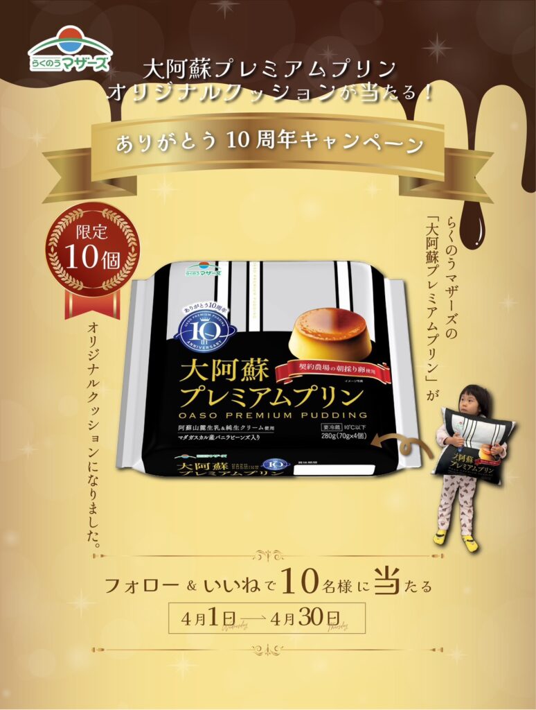- 抽選で10名様に「大阿蘇プレミアムプリン オリジナルクッション(10周年Ver)」が当たる