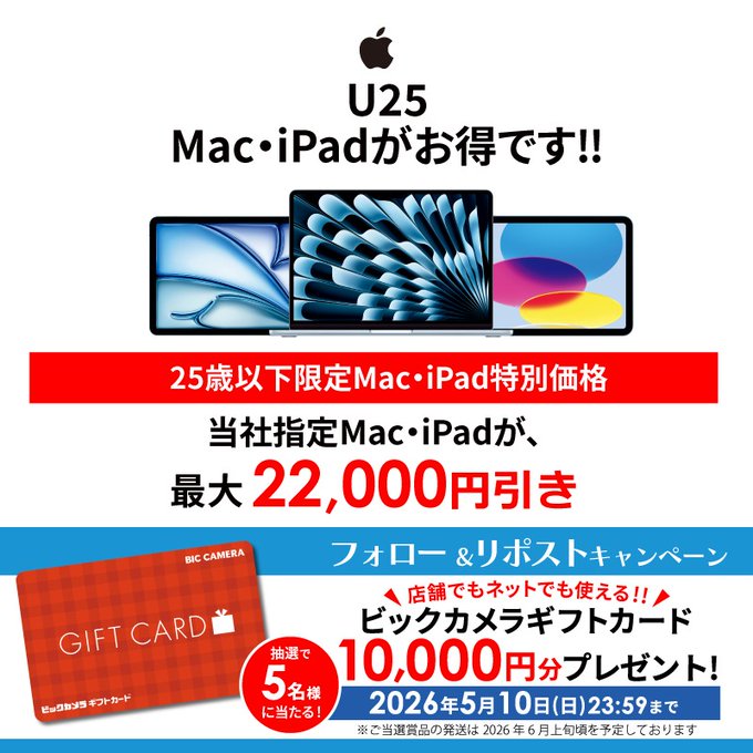 - 抽選で5名様に「ビックカメラギフトカード10,000円分」をプレゼント